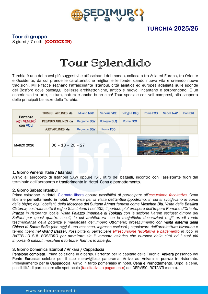 Tour Splendido ogni venerdì con volo da mxp, vce, blq, fco, bgy, nap e bri a Marzo 8 giorni