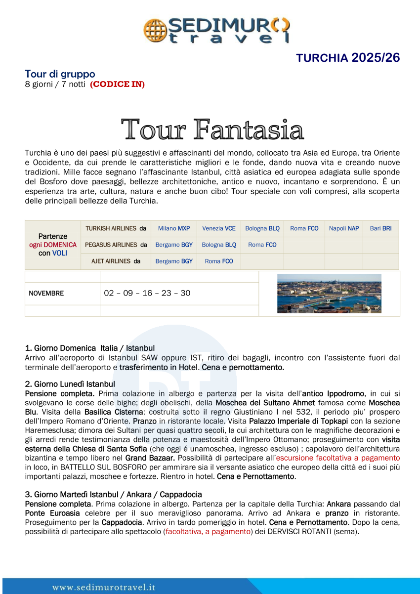 Tour Fantasia ogni domenica con volo da mxp, vce, blq, fco, bgy, nap e bria Novembre 8 giorni